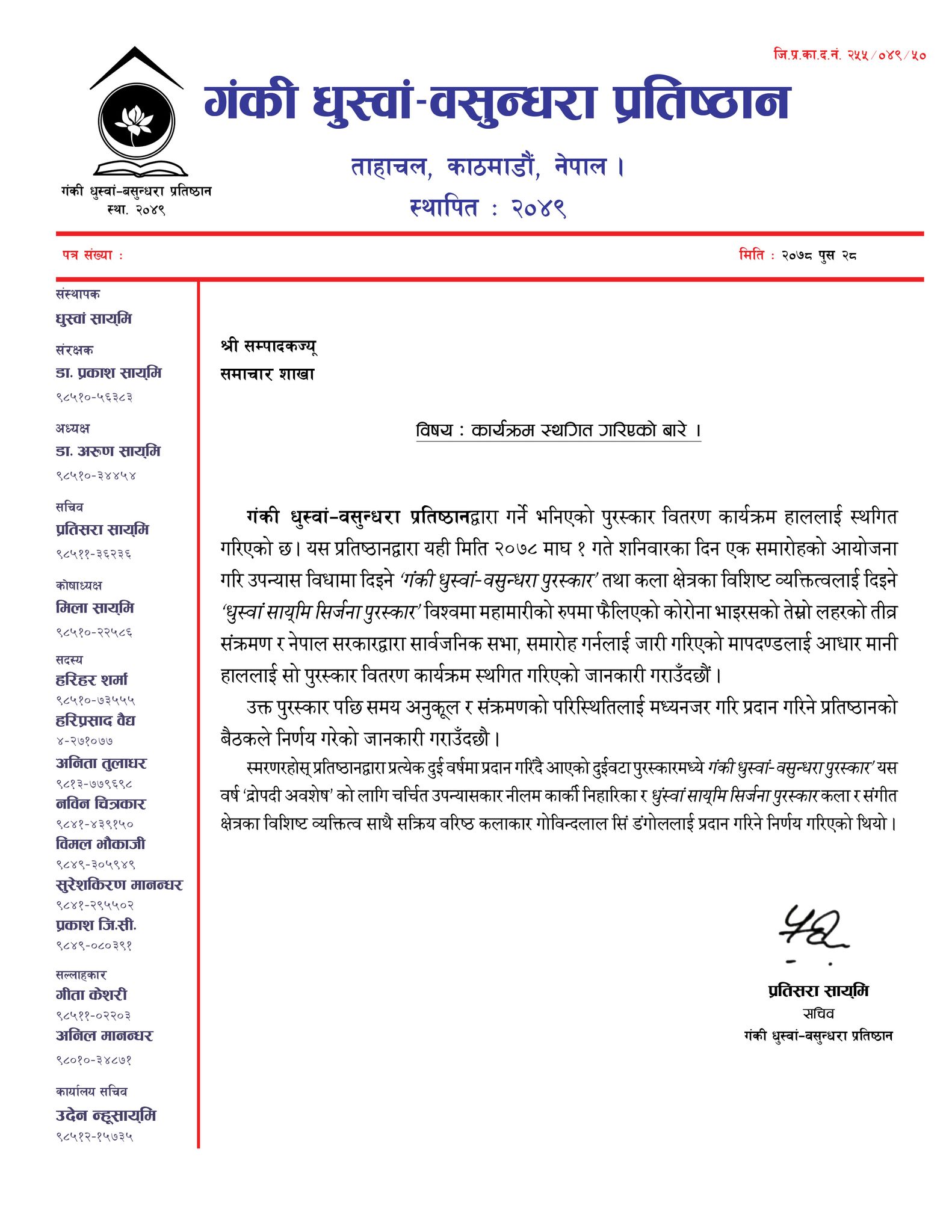 गंकी धुस्वां–वसुन्धरा प्रतिष्ठानपाखें लःल्हाइगु सिरपा इने ज्याझ्वः दिकागु प्रतिष्ठानया सचिव प्रतिसरा साय्मिं छगू विज्ञप्ति पितबिसें जानकारी ब्यूगु दु ।