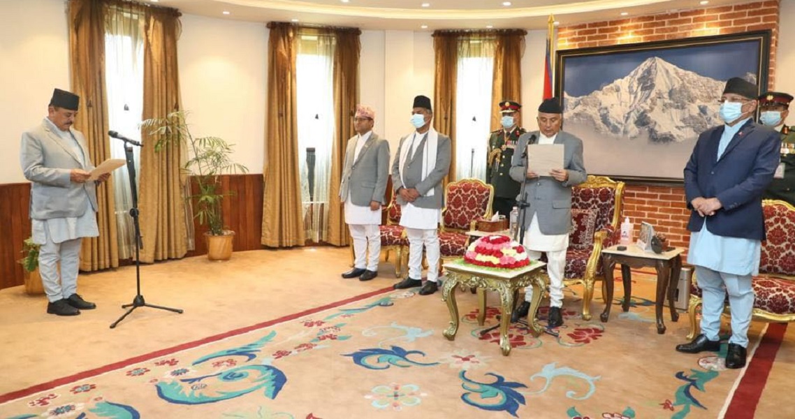 मन्त्रीइ नियुक्त आचार्यं राष्ट्रपतिया कार्यालय शीतल निवासय् थाैं हे शपथ ग्रहण याःगु दु । वय्कःयात राष्ट्रपति रामचन्द्र पौडेलं पद तथा गोपनीयताया शपथ नकूगु खः ।
