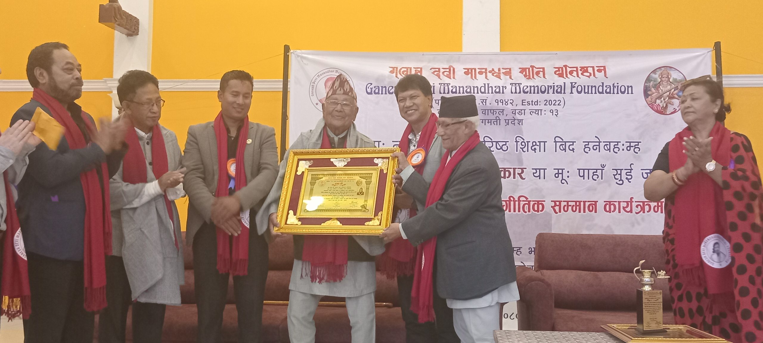 गणेशदेवी मानन्धर स्मृति प्रतिष्ठानया ग्वसालय् नेपालभाषा ख्यलय् याेगदान यानाच्वंपिं स्वम्ह व्यक्तित्वपिन्त छगू ज्याझ्वःया दथुइ शनिवाः इनेज्या याःगु दु । थथे हनेज्या याःगु ज्याझ्वलय् जन गायक भृगुराम श्रेष्ठ, वरिष्ठ सिनेपत्रकार बिजयरत्न असंबरे व न्हूगु प्रतिभा कथं म्येहालामि सिद्धार्थ बज्राचार्ययात छगू समाराेह दथुइ तःजिक सम्मान एवं सिरपा शनिवार मरूहिति ब्यांक्वेटय् लःल्हात । प्रतिष्ठानया नायः बिजय कुमार मानन्धरया सभानायःसुइ न्ह्याःगु ज्याझ्वलय् बागमति प्रदेशया सभासद माननीय शैलेन्द्रमान बज्राचार्य, नेवाः देय् दबूया नायः पवित्र बज्राचार्य पाहां कथं व वरिष्ठ शिक्षाविद् हितकर वीर सिंह कंसाकार मू पाहांकथं झायादीगु खः ।