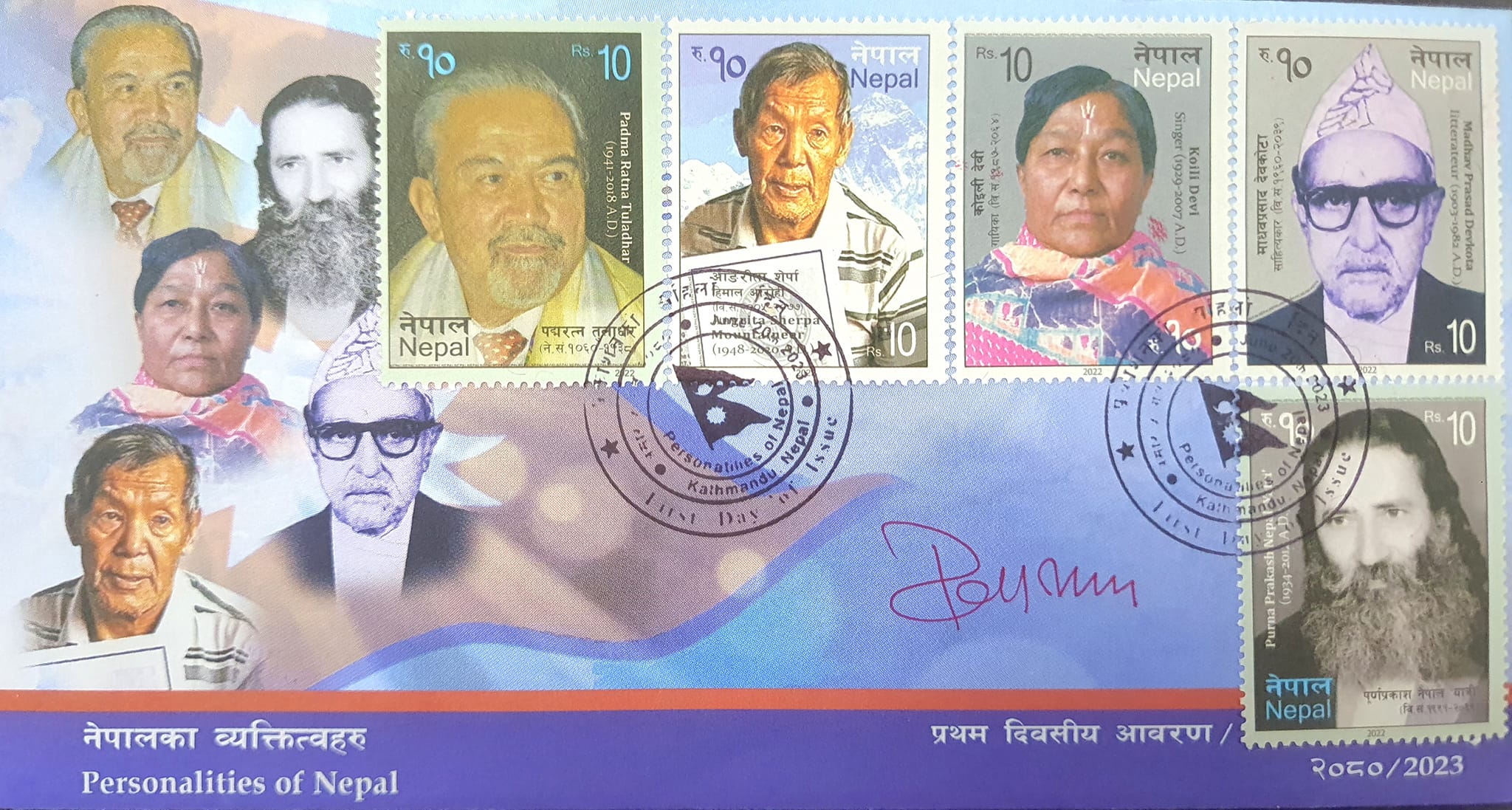हुलाक सेवा विभागं मानव अधिकारकर्मी नेवाः न्ह्यलुवाः पद्मरत्न तुलाधर, साहित्यकार पूणर्प्रकाश नेपाल ‘यात्री’, पर्वतारोही आङरिता शेर्पा, कवि माधवप्रसाद देवकोटा व गायिका कोइली देवीया नामय् टिकट पिथंगु खः ।