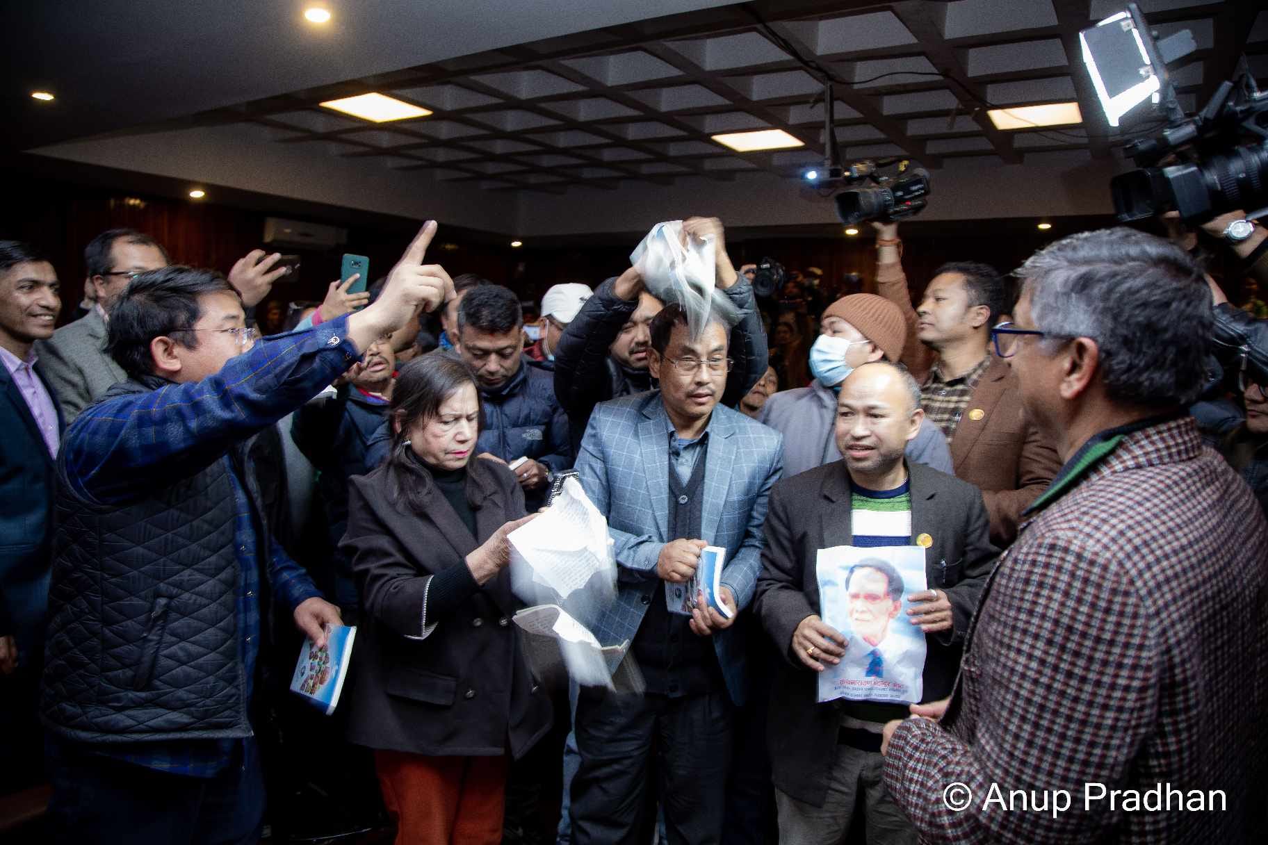महासंघया प्रतिष्ठान प्रदेशपाखें ग्वसाःग्वःगु ज्याझ्वलय् मूपाहाँकथं सभामुख देवराज घिमिरे व विशेष पाहाँकथं सञ्चार तथा सूचनाप्रविधि मन्त्री रेखा शर्मायात ब्वनातःगु खः । तर ज्याझ्वलय् विरोध जुइगु सुचं वय्कःपिन्थाय् थ्यनेवं वय्कःपिं निम्हं हे ज्याझ्वलय् झायामदी । मूपाहाँ व विशेष पाहाँ निम्हं ज्याझ्वलय् मथ्यनीगु जुइवं अन दुपिं पूर्व अध्यक्षपिनिपाखें सुफू विमोचन याकेगु उद्घोष जुइवं फोनिज व दबूया दुजःपिसं मञ्च घेराउ यानाः विमोचनयात पनाब्यूगु खः ।