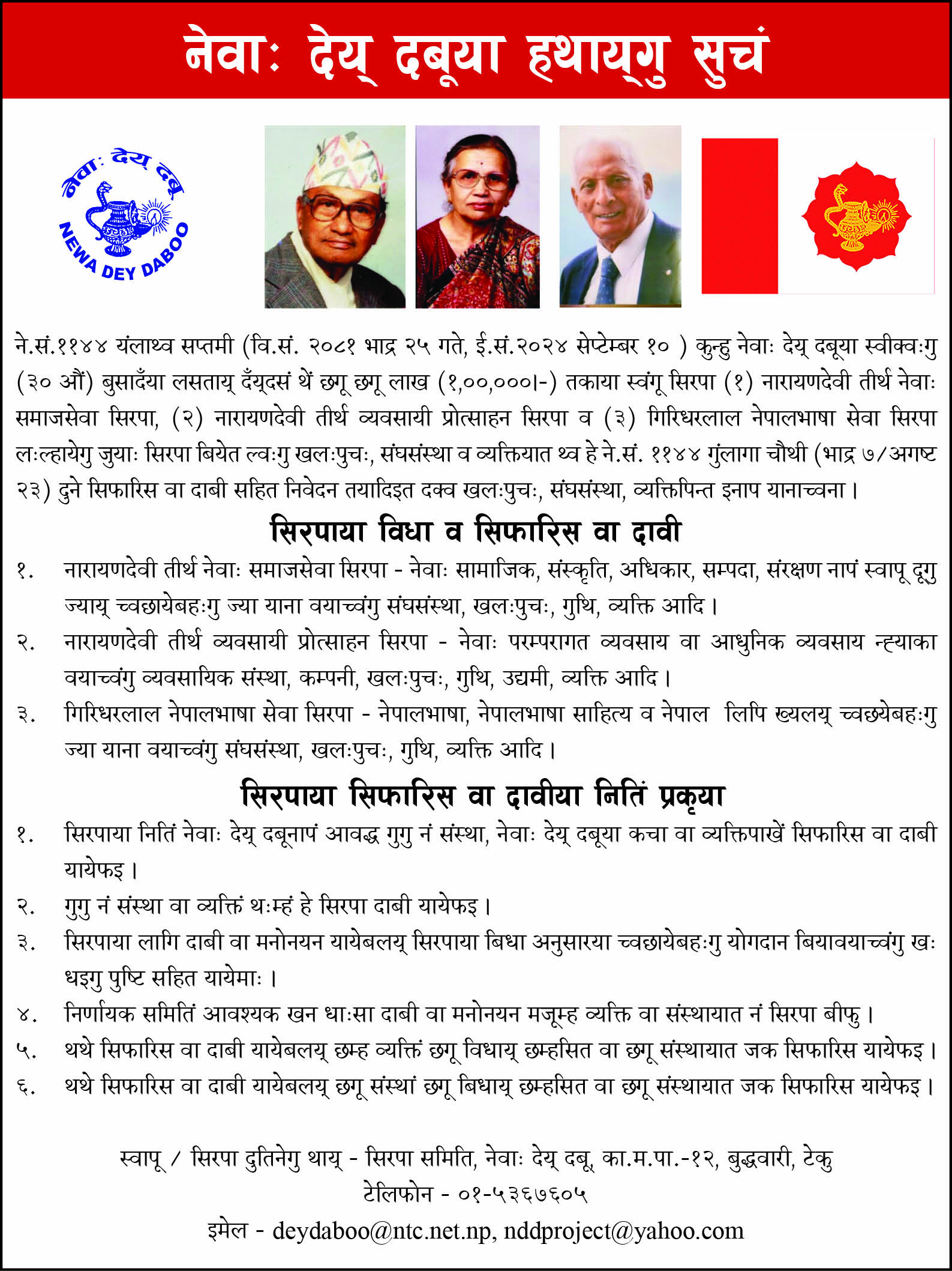 थ्व हे भाद्र २५ गते शनिवाः जुइगु ज्याझ्वलय् लःल्हाइगु नारायणदेवी तीर्थ नेवाः समाजसेवा सिरपा, नारायणदेवी तीर्थ व्यवसायी प्रोत्साहन सिरपा व गिरिधरलाल नेपालभाषा सेवा सिरपा लःल्हाइगु जूगु दु । थुगु सिरपा बियेत ल्वःगु खलःपुचः, संघसंस्था व व्यक्तियात थ्व हे ने.सं. ११४४ गुंलागा चौथी (भाद्र ७/अगष्ट २३) दुने सिफारिस वा दाबी सहित निवेदन तयादिइत दक्व खलःपुचः, संघसंस्था, व्यक्तिपिन्त दबूपाखें इनाप याःगु दु ।
