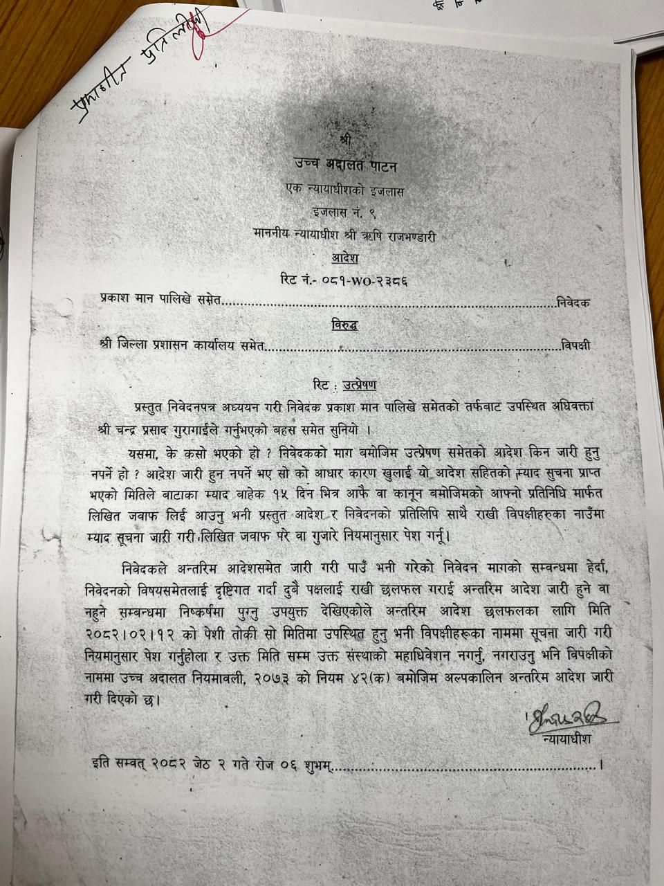 प्रकाश मान पलिखें जिल्ला प्रशासन ज्याकूलिसेंयात विपक्षी दयेकाः दायर याःगु रिट निवेदनया लिधंसाय् उच्च अदालत पाटनं थुगु अादेश जारी याःगु खः ।